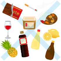食:カレー、ソース系、みそ、醤油、チョコ、あんこ、からし、ワサビ、緑黄色野菜など色のついた野菜や果物
