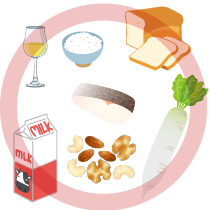 食:ごはん、パン、白身魚(塩焼き)、鶏肉、貝柱、エビ、しらす、大根、ナッツ類、チーズ、ヨーグルト、フライドポテト、ホワイトソースなど